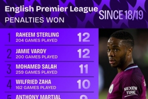 體育資訊10月12日訊 Squawka統(tǒng)計了2018-2019賽季以來球員在英超造點的次數(shù),并列出榜單,斯特林、瓦爾迪12次居首,薩拉赫11次第三。