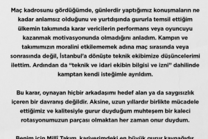 當(dāng)看到比賽名單時(shí),我才意識(shí)到這些天來(lái)的溝通毫無(wú)意義——那些在海外為國(guó)爭(zhēng)光的球員,在國(guó)家隊(duì)決策者眼中,其表現(xiàn)和斗志根本不被重視。為避免影響集訓(xùn)營(yíng)和球隊(duì)士氣,我選擇在返回伊斯坦布爾后向技術(shù)團(tuán)隊(duì)傳達(dá)了我的想法,而非在比賽期間或賽后,隨后在‘技術(shù)和管理團(tuán)隊(duì)知情并同意’的情況下,我自愿離開(kāi)了集訓(xùn)營(yíng)。
