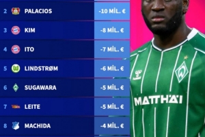 2、帕拉西奧斯(勒沃庫森):-1000萬歐元