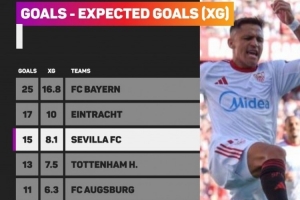 3.塞維利亞:15球,預期進球數(shù)8.1,正負值+6.9