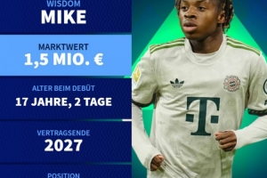 體育資訊9月28日訊 在本輪德甲拜仁4-0大勝不萊梅的比賽中,17歲小將麥克替補(bǔ)登場迎來一線隊首秀。