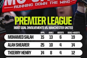 體育資訊10月17日訊 北京時間10月19日晚上,利物浦將在英超第8輪比賽中主場對陣曼聯(lián),Squawka統(tǒng)計(jì)了球員在對陣曼聯(lián)的英超比賽中的參與進(jìn)球數(shù)量,薩拉赫19球居首。