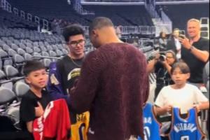 體育資訊10月20日訊 美媒昨日曬出視頻,威少為小球迷們簽名,簽了雷霆與火箭的,唯獨略過了湖人的。