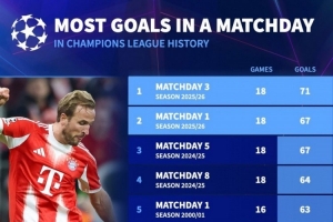 體育資訊10月23日訊 德國轉會市場統計了歐冠單輪比賽進球數量,并列出歐冠歷史單一輪次進球排名,本輪歐冠打進71球居首。