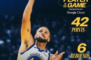 全場比賽庫里25中14、其中三分12中6,轟下42分6板7助1帽,下半場28分,包括關(guān)鍵時刻連得球隊的16分。