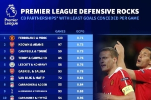 體育資訊10月24日訊 《轉(zhuǎn)會市場網(wǎng)》統(tǒng)計了英超歷史場均丟球數(shù)最少的20組中后衛(wèi)搭檔,該榜單只統(tǒng)計合作了50場以上的中后衛(wèi)搭檔。