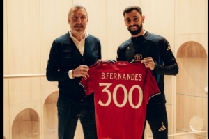 曼聯(lián)官推也曬出了B費被贈送印有300字樣的紀念球衣的照片,并配文:“B費將在周六迎來他在曼聯(lián)的第300場比賽。”