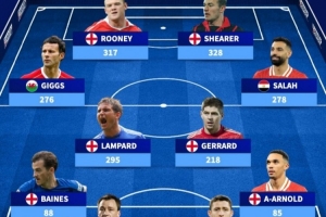 體育資訊10月25日訊 《轉(zhuǎn)會市場》列出了各個位置的英超歷史參與進球最多陣容,薩拉赫、阿諾德連線右路。