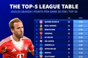 本賽季五大聯(lián)賽場均拿分榜:拜仁3分拿滿 皇薩槍列前四、巴黎第12