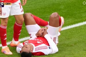 比賽第68分鐘,加布里埃爾爭頂時(shí)高高躍起后落地,下體重重撞上立柱。