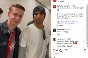 巴黎邊衛(wèi)阿什拉夫來到伯納烏,觀看了這場國家德比,見證老東家取勝,球迷社媒曬出與阿什拉夫的合照。