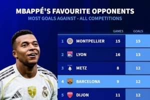 體育資訊10月27日訊 皇馬在本輪西甲焦點戰(zhàn)2-1力克巴薩,姆巴佩取得進球。《轉(zhuǎn)會市場》統(tǒng)計顯示,巴薩也是姆巴佩生涯各項賽事進球第4多的對手。