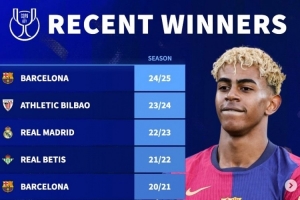 德轉(zhuǎn)列近10年國王杯冠軍: