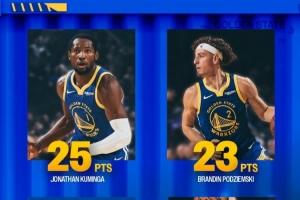 體育資訊10月29日訊 勇士官方社媒更新動態(tài),曬出了昨日四人得分20+的海報,并配文寫道:“四面開花!昨晚勇士有四名球員得分20+。”