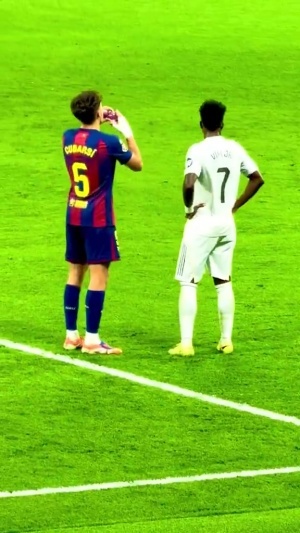在比賽中,皇馬邊鋒維尼修斯從場(chǎng)邊拿了一瓶水走進(jìn)場(chǎng)內(nèi),口渴的巴薩后衛(wèi)庫(kù)巴西上前討水喝,巴西人沒(méi)有猶豫直接遞給了西班牙后衛(wèi)。