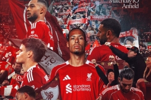 利物浦官方社媒發(fā)布了此役的海報,范戴克、?;倏?、薩拉赫、索博斯洛伊、加克波、凱爾凱茲出鏡。