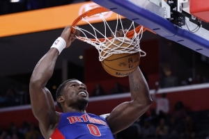 活塞內(nèi)線杜倫上半場表現(xiàn)不錯,尤其是第二節(jié)在球隊落后時,他在內(nèi)線表現(xiàn)活躍,不僅有空接暴扣,還有搶下前場籃板后的暴扣,幫助球隊縮小分差。