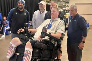 體育資訊11月06日訊 前NBA球員、53 歲的“大竹竿”肖恩·布拉德利今日坐輪椅觀戰(zhàn)獨(dú)行俠,并與他的獨(dú)行俠前隊友波派·瓊斯聊天。