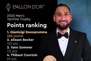 體育資訊09月27日訊 2025年雅辛獎排名詳情公布,榮獲該獎項(xiàng)的意大利門將多納魯馬以486分?jǐn)鄬宇I(lǐng)先,第2名阿利森獲得120分,第3名索默獲得112分。