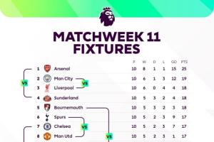 體育資訊11月07日訊 本周末將迎來英超第11輪的較量,賽前英超官方用一張圖表清晰展示了本輪交手各隊的名次對比。