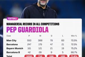 執(zhí)教生涯1000場比賽,瓜迪奧拉取得了716勝156平128負(fù)的戰(zhàn)績,勝率超過7成。