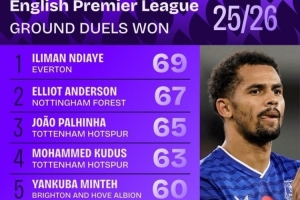 體育資訊11月11日訊 英超聯(lián)賽已經(jīng)進行了11輪,squakwa也統(tǒng)計了本賽季英超地面成功對抗次數(shù),埃弗頓前鋒恩迪亞耶居首。