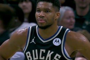 GIF-字母哥反擊撞翻普拉姆利,歐洲步劈扣2+1,黃蜂挑戰(zhàn)成功變進(jìn)攻犯規(guī)