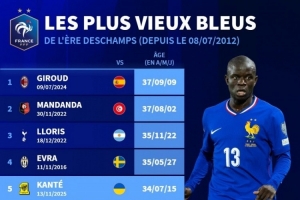 體育資訊11月15日訊 世預(yù)賽歐洲區(qū)比賽,坎特踢滿(mǎn)全場(chǎng),幫助法國(guó)主場(chǎng)4-0擊敗烏克蘭,德轉(zhuǎn)列出了德尚執(zhí)教法國(guó)隊(duì)以來(lái)年齡最大出場(chǎng)球員排名,吉魯居首,坎特排在第5位。