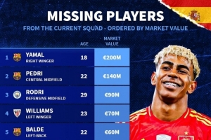 體育資訊11月16日訊 德國(guó)轉(zhuǎn)會(huì)市場(chǎng)統(tǒng)計(jì)了無(wú)緣本期西班牙隊(duì)球員身價(jià),并列出榜單,亞馬爾2億歐居首。