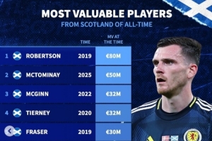 體育資訊11月16日訊 德轉(zhuǎn)統(tǒng)計(jì)蘇格蘭球員歷史身價(jià)排行榜,2019年羅伯遜8000萬(wàn)歐居首,今年麥克托米奈5000萬(wàn)歐第二。