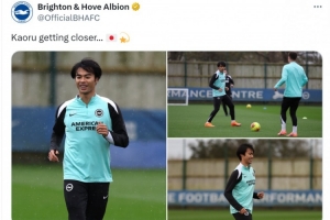 布萊頓社媒曬出三笘薫的照片,確認(rèn)這位日本攻擊手恢復(fù)訓(xùn)練,配文:“三笘薫距離復(fù)出更近了?!?/p>