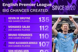 19-20賽季以來英超創(chuàng)造重大機(jī)會榜:德布勞內(nèi)、薩拉赫、B費(fèi)前三