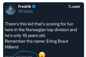 2018年9月23日,記者Fredrik在社交媒體上寫道:“挪威頂級聯(lián)賽有一個少年,進(jìn)球如同探囊取物,而他只有18歲。請記住這個名字——埃爾林·布賴于特-哈蘭德?!?/p>