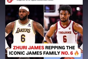 詹姆斯轉(zhuǎn)發(fā)了媒體曬出的他和三個子女都身穿6號球衣的照片。詹姆斯的兩個兒子布朗尼和布萊斯在大學(xué)打籃球時(shí)都身穿6號球衣,女兒Zhuri在學(xué)校打排球時(shí)身穿6號球衣。詹姆斯本人在熱火和湖人也有6個賽季身穿6號球衣。