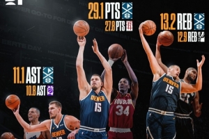 約基奇賽季至今場(chǎng)均29.1分13.2籃板11.1助攻