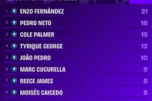 據(jù)Squawka統(tǒng)計,恩佐·費爾南德斯2025年打進11球,助攻10次,他是切爾西隊內(nèi)同期唯一進球、助攻皆上雙的球員。