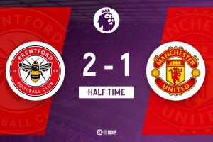 上半場傷停補時4分鐘,半場結(jié)束,曼聯(lián)暫1-2布倫特福德。