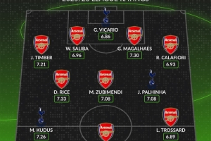 中場:賴斯(阿森納,7.33分)、蘇維門迪(阿森納,7.08分)、帕利尼亞(熱刺,7.09分)
