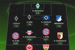 中場:邁克爾·奧利塞(拜仁,10.00分)、阿?!ろf德拉奧果(萊比錫,8.58分)、倫納特·卡爾(拜仁,8.57分)、迪米特里斯·吉安努利斯(奧格斯堡,7.95分)