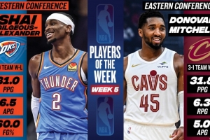 體育資訊11月25日訊 今日NBA官方宣布,亞歷山大和米切爾分別當選25-26賽季第5周西部和東部周最佳球員。