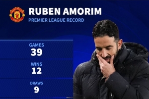 德國轉會市場統(tǒng)計了阿莫林執(zhí)教曼聯(lián)的英超數(shù)據(jù),他帶領曼聯(lián)參加39場英超比賽,戰(zhàn)績12勝9平18負,凈勝球-10,場均拿到1.15分。