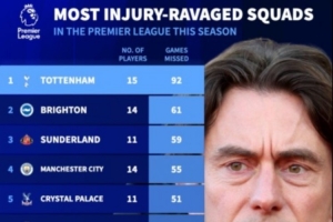 體育資訊11月25日訊 德轉(zhuǎn)列本賽季英超球隊(duì)傷病榜,熱刺15名球員受傷,共計(jì)缺席92場比賽排名第一,布萊頓、桑德蘭位列二三位。