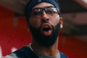 視頻當(dāng)中,濃眉戴著護目鏡底角三分一發(fā)入魂,場邊的歐文搞怪互動。
