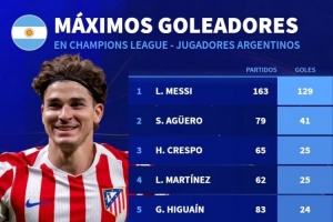 體育資訊11月28日訊 德國(guó)轉(zhuǎn)會(huì)市場(chǎng)統(tǒng)計(jì)了阿根廷球員在歐冠比賽中的進(jìn)球數(shù)量,并列出榜單,梅西129球居首,阿圭羅次席,阿爾瓦雷斯18球第9。