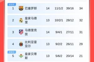 最新積分榜方面:先賽的巴薩憑借2分優(yōu)勢暫升榜首,排名第2的皇馬明日凌晨將客戰(zhàn)赫塔費,同樣先賽的馬競積分反超黃潛暫時來到第3。
