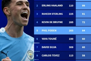體育資訊11月30日訊 在本輪英超,曼城3-2擊敗利茲聯(lián),福登梅開二度。以下為曼城隊史英超射手榜: