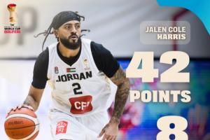 此役,約旦歸化球員、前同曦外援杰倫·哈里斯表現(xiàn)神勇,他登場29分56秒24投13中,三分16中8、罰球9中8,狂砍42分6籃板2助攻2搶斷,正負(fù)值+49。