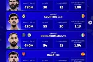 體育資訊12月2日訊 《轉(zhuǎn)會市場》評選2025年最佳門將,并列出了4人候選同時對比了他們的數(shù)據(jù):