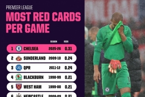 體育資訊12月2日訊 Opta統(tǒng)計了英超球隊各賽季的場均紅牌數量,并列出英超歷史單賽季場均紅牌數量排名,本賽季切爾西0.31張居首。