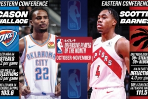 體育資訊12月3日訊 今日NBA官方公布了10-11月東西部月最佳防守球員,雷霆球員卡森·華萊士和猛龍球員斯科蒂·巴恩斯分別當選。